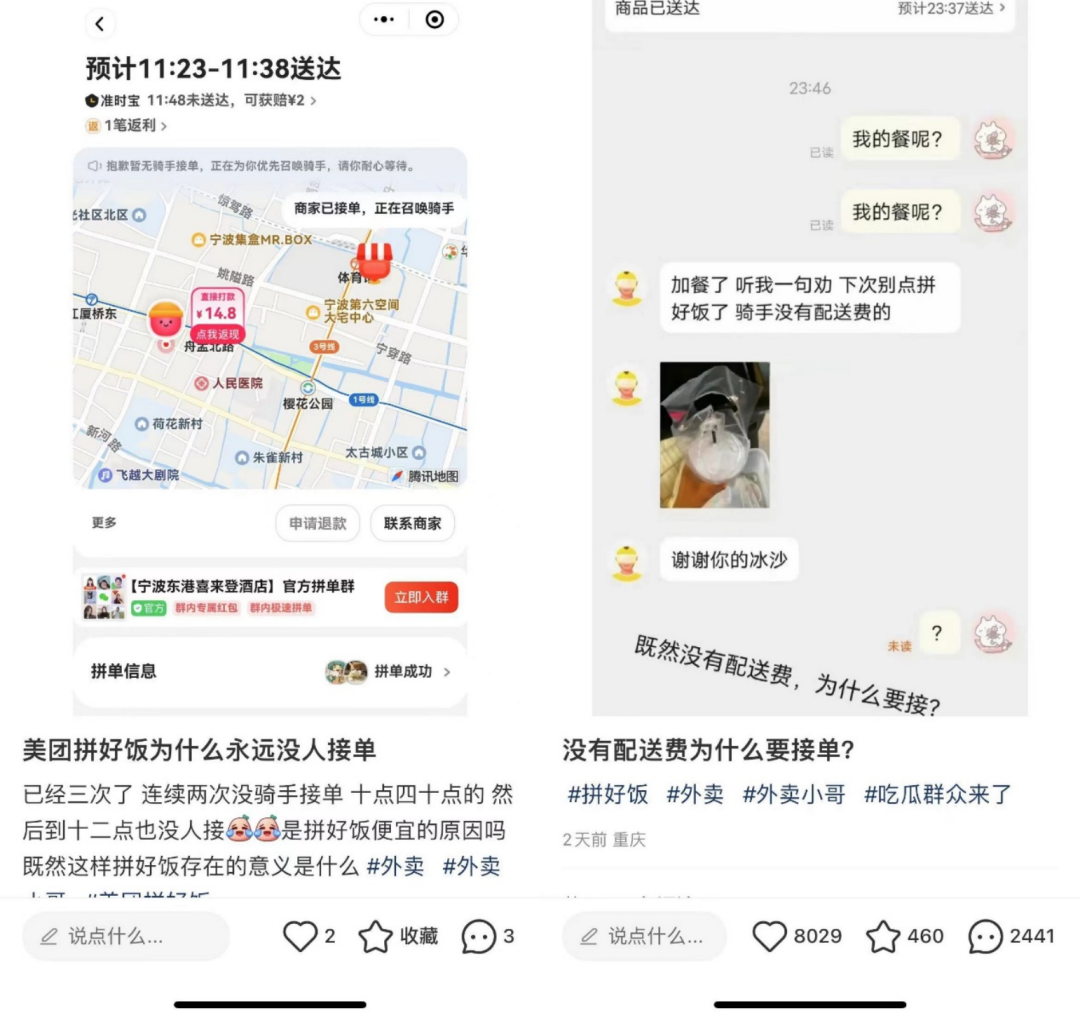 對用户來説,看似通過“拼好飯”薅了羊毛,但也有不少用户表示騎手不願意將“拼好飯”配送到位,個別商家的拼單餐品和普通外賣也有區別,這些影響似乎暫時難以杜絕。