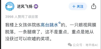 不用想這又是一個陰陽怪氣的團建提問,提問早期清一色的都是陰陽怪氣的回答。總的來説就是“外國人都不玩,所以中國才能拿這麼多金牌”,也有的説“跳水是窮人才玩的”,“跳水對運動員傷害太大、不人性,所以老外不玩”,甚至已經有人往“反人類”上帶節奏了。