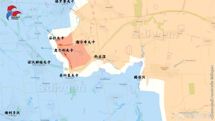 4、紅軍村:俄軍沿鐵路取得重大進展,控制了奧爾利夫卡以及麥科萊夫卡和茹拉夫卡的部分地區。此外,俄軍在格羅季夫卡內部也取得了新的進展。