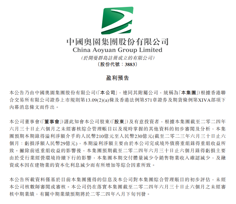 8月14日深夜,中國奧園發佈了2024年中期盈利預告。公告顯示,奧園預計期內錄得溢利淨額約210億元至230億元,而上年同期為虧損淨額29億元。