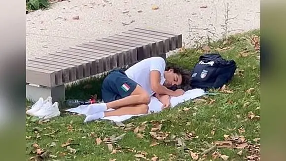 ● 意大利奧運冠軍托馬斯·切孔睡在公園草地上