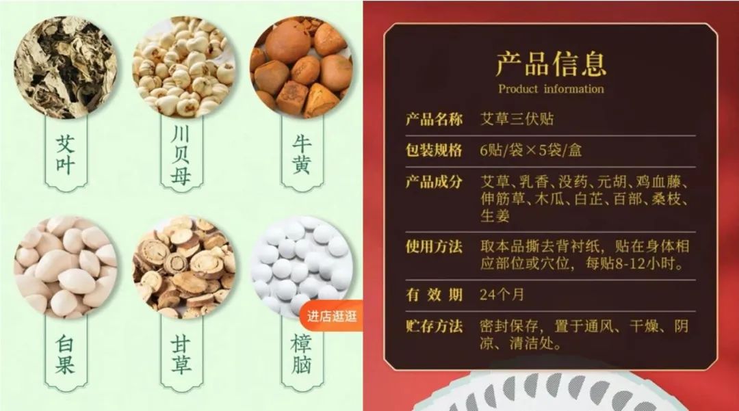 在某月銷量過萬,宣稱“一貼起效”的三伏貼包裝上,由“艾葉、川貝母、牛黃、白果、甘草及樟腦”這幾味中藥構成的配方中,牛黃性涼,川貝和白果油脂高,易助長濕熱,要真的堅持貼下去,反而對虛寒類病症適得其反;另一張由艾草、乳香、元胡、雞血藤、伸筋草、木瓜等組成的配方表中,“雞血藤”和“木瓜”這兩味藥材,以根莖為主,主要用於滋陰養血,不宜作為敷貼使用,該避免的禁忌一個不拉的都加了進去。
