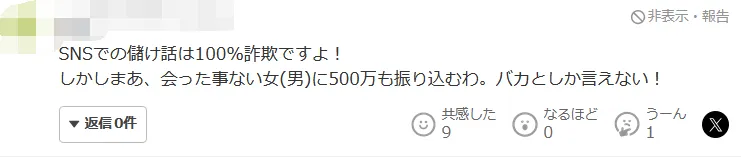 在SNS上賺錢是100%騙局!可是,給一個沒見過的女人(男人)匯500萬。只能説白痴!