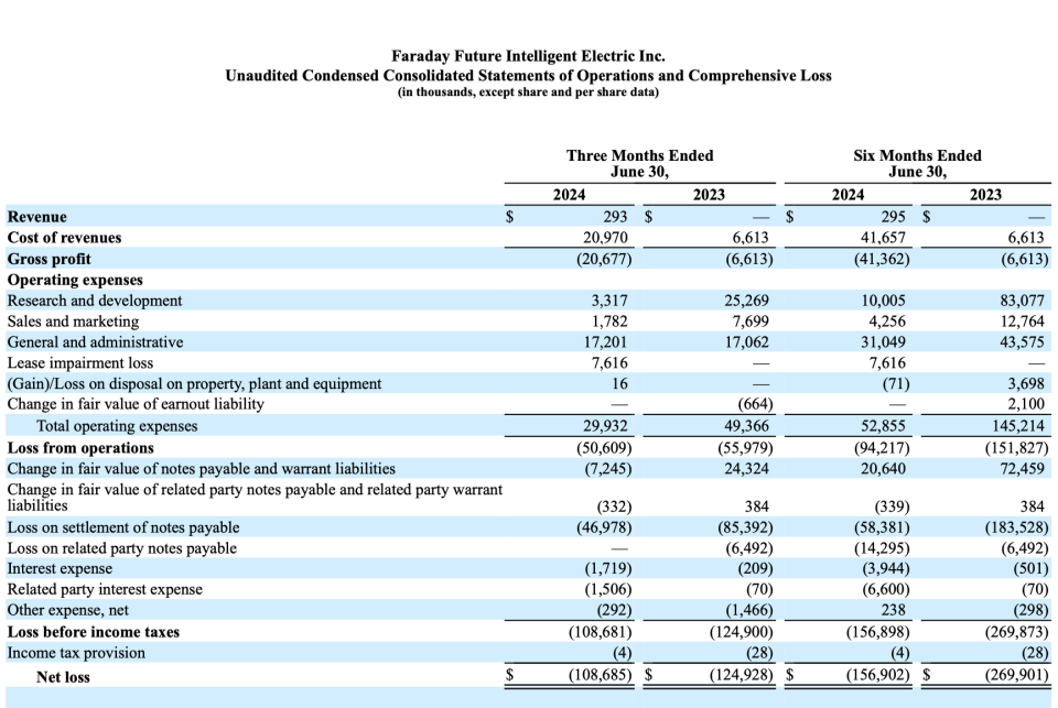 2024年上半年,法拉第未來累計實現營收29.5萬美元;研發、銷售成本大幅降低之下,淨虧由去年同期的2.70億美元降至1.57億美元;截至6月30日,該公司賬面總資產約為4.58億美元,總負債約為3.09億美元,淨資產約為1.49億美元。