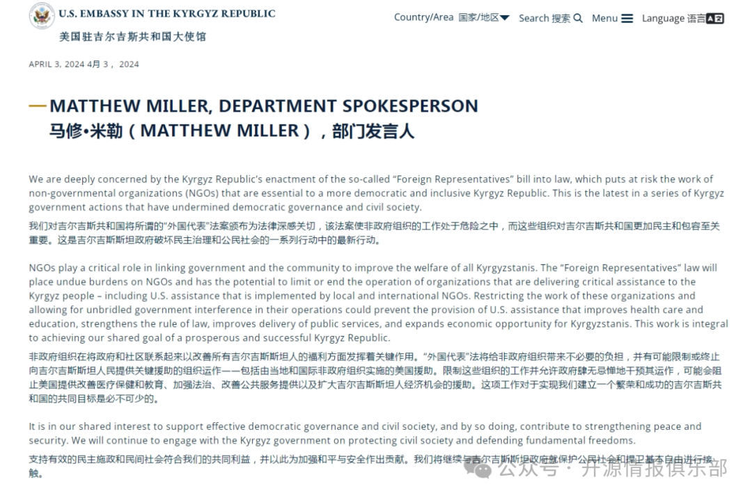 例如,2024年4月上旬,美國國務院對吉爾吉斯斯坦通過一項控制非營利組織活動的法律表示擔憂。時任美國國務院發言人馬修·米勒發佈的聲明中稱:“這是吉爾吉斯斯坦政府破壞民主治理和公民社會的一系列行動中的最新一起。”表示非政府組織理應在“將政府和社會團結在一起方面發揮着關鍵作用,限制此類組織的工作以及政府對其活動的干預可能會干擾美國提供的援助。