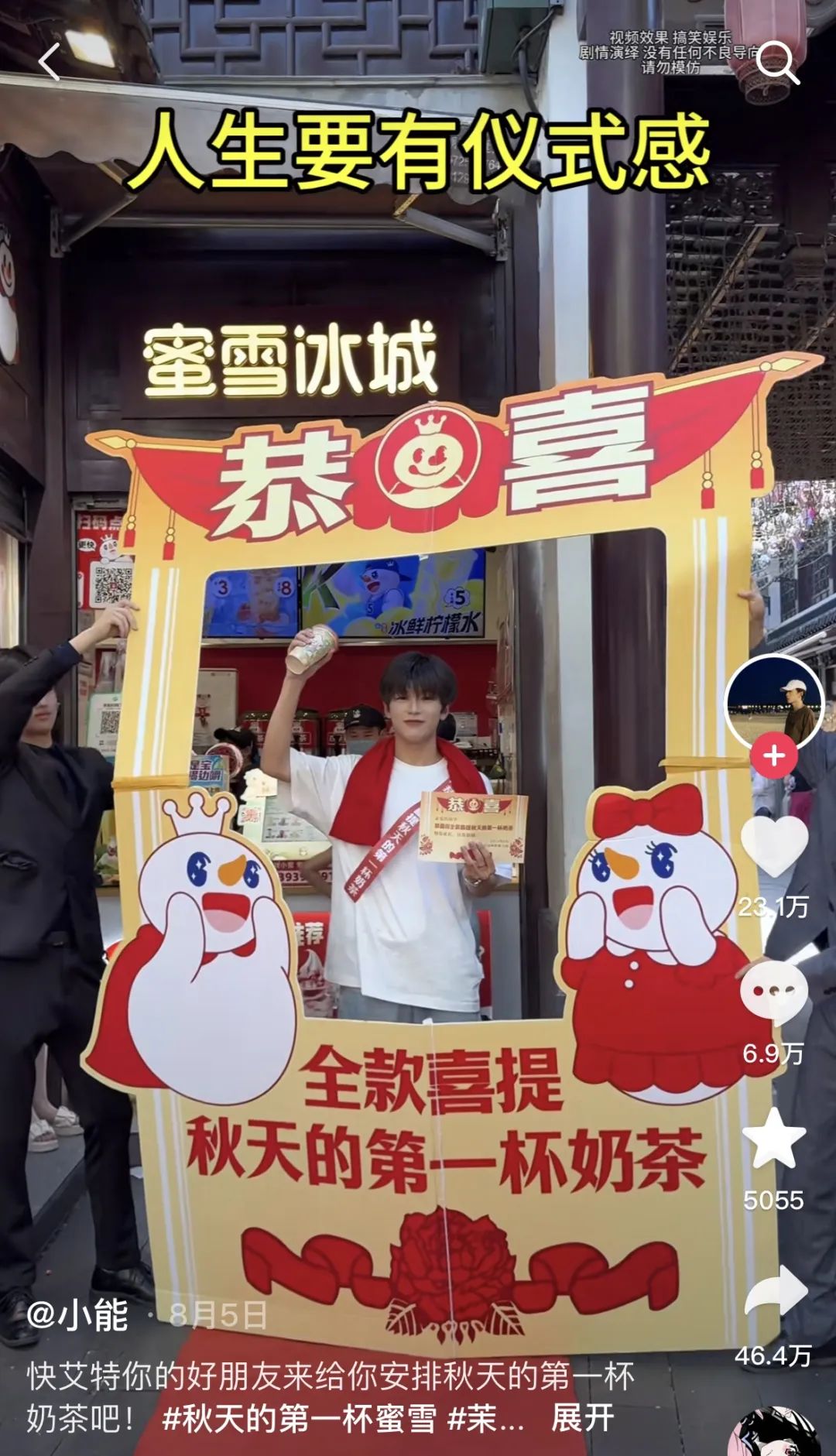 “秋一杯”的熱度由普通用户和各家奶茶品牌們自發在內容平台上不斷共創、烘托,立秋喝奶茶成了一個新的“互聯網賽博習俗”,圖的不是那一杯十幾二十塊的奶茶,而是圖個熱熱鬧鬧開開心心“過節”的感覺。