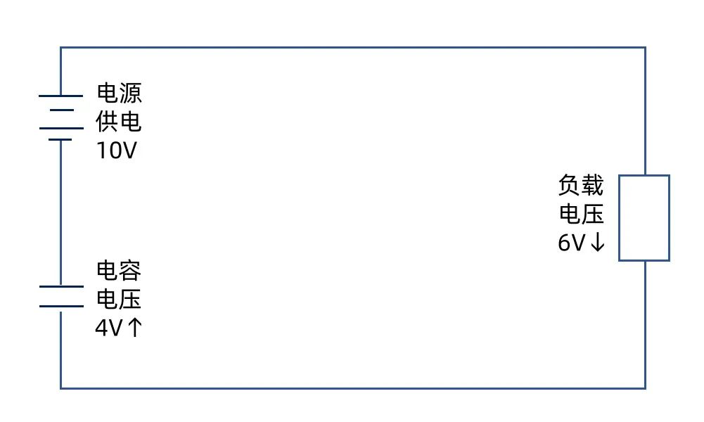 而隨着時間的推移,因為電容的固有特性,電容C的電壓會逐漸上升,而因為電容與負載是串聯的關係,當電容電壓上升時,對應的負載電壓也隨之下降,當電容電容上升到6伏時,此時負載電壓已經下降到了4伏。