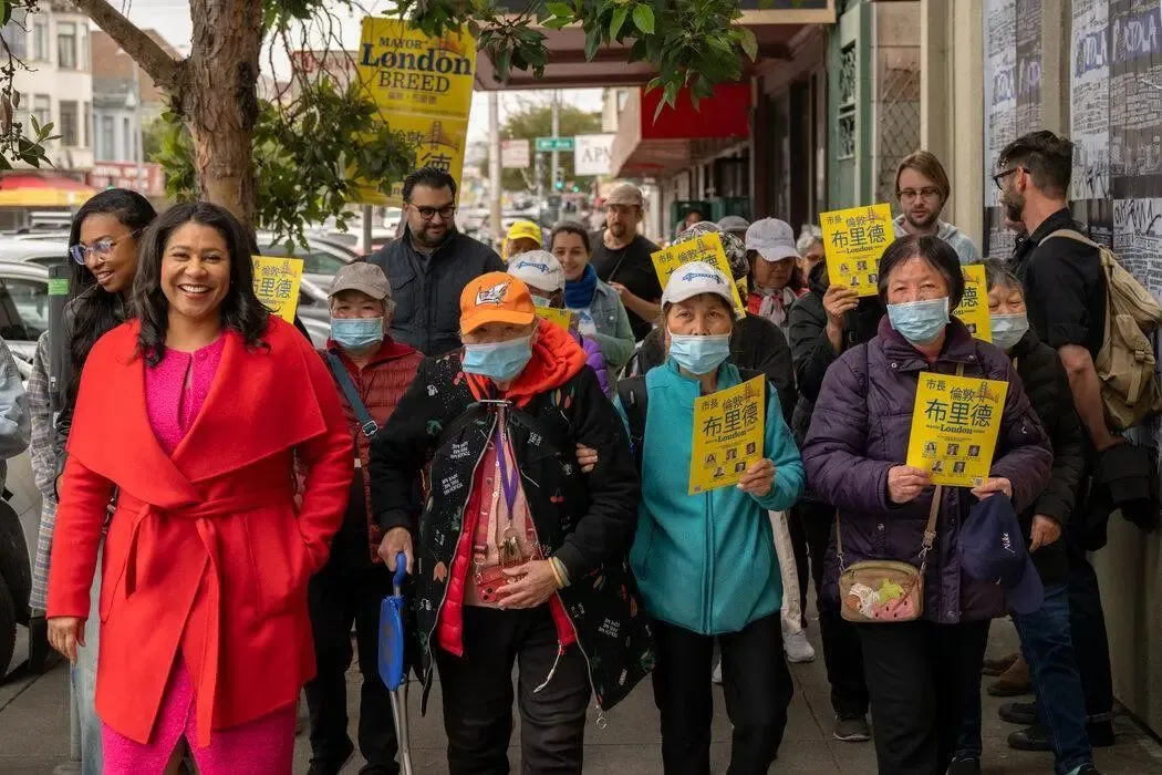 6月,舊金山市長布里德(左)與競選志願者在舊金山裏士滿區。來源:NYT