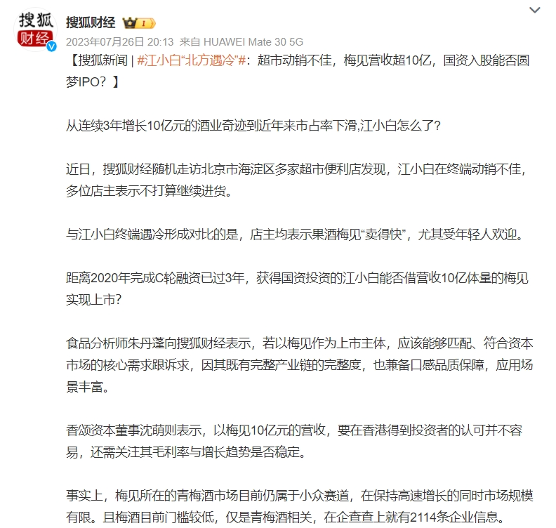 在江小白品牌聲勢減弱的背景下,有業內人士指出若以梅見作為上市主體,或許能夠匹配、符合資本市場的核心需求跟訴求,因其既有完整產業鏈的完整度,也兼備口感品質保障,應用場景豐富。
