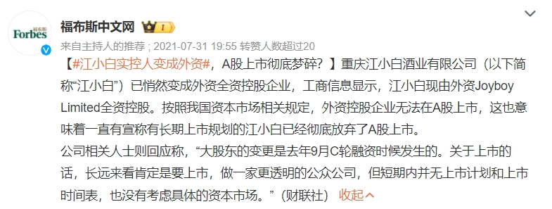 不過,早在2021年江小白控股股東變更為港資公司JoyboyLimited,被業內解讀為江小白在為上市做鋪墊。當時,江小白方面對此表示,創辦Joyboy Limited,是江小白基於公司中長期戰略以及相應的資本策略進行的安排;此做法的確是很多已在香港上市的大陸企業較常規的結構,但短期內江小白還沒有上市的具體時間表和相關規劃。
