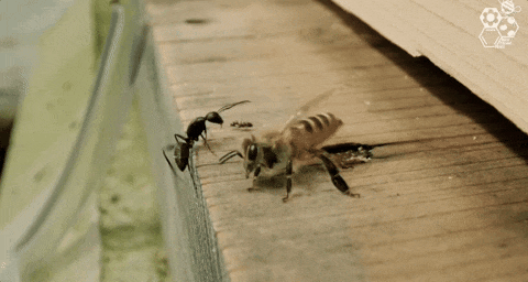 一段視頻中,一隻螞蟻在試圖進入日本蜜蜂的蜂箱時,與一隻防守蜂相遇了。日本的螞蟻通常不會對蜜蜂構成生命威脅,但會吃掉蜂巢中那些富含蛋白質的卵和香甜的蜂蜜,所以這隻防守蜂誓死也要守住大門。