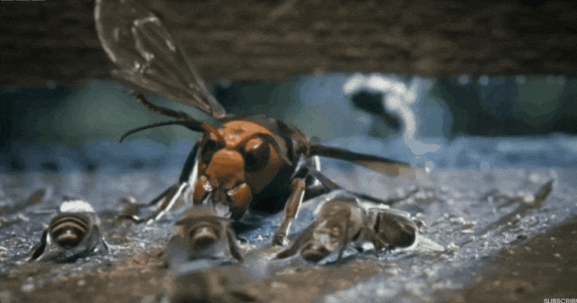 胡蜂(圖中較大的昆蟲)是蜜蜂的最主要天敵之一,雖然叫“蜂”,但並不屬於同一物種|圖源:Scientific American