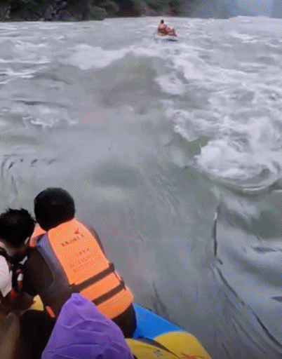 另一個則是翻船。沒有經驗的漂流人在遭遇翻船意外後很容易受傷,甚至有船翻後把人壓在下面的情況發生——比如就曾有遊客被悶在船底將近50秒才被救出。