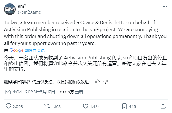 當天H2M官推就宣佈他們團隊收到了來自動視的侵權通知,並聲稱將“立即且永久關停一切運營”。在此之後,官推的簡介就只剩下了一個大寫的單詞:“已終結”(SHUTDOWN)。
