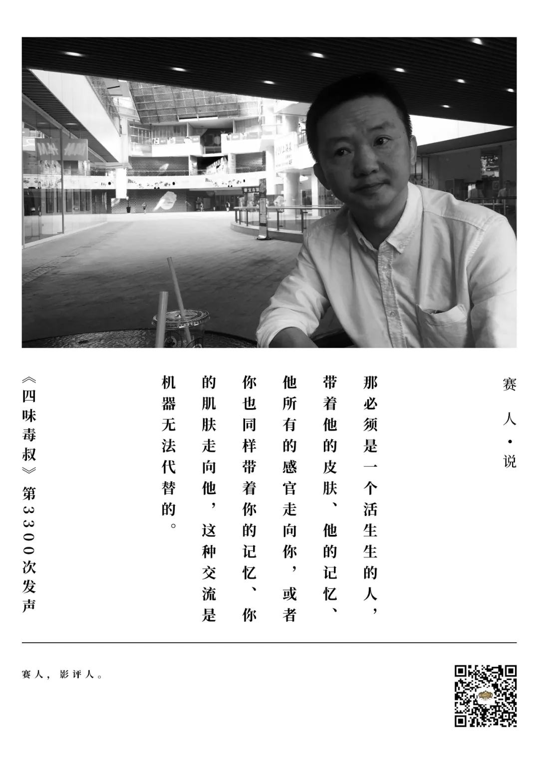 **賽人:**當電影出現的時候,人們可能會以為話劇會消失,但話劇依然存在。有些東西我不知道是什麼,反正這些藝術形式是無法被替代的,它們一直就在我們身邊,一直保持着它們的存在。在電影發展的這100年裏,其實這100年證明了電影不會消失,因為它的存在方式可能會有所變化,形態也可能會更新,但電影的本體性不會消失的,它仍然在那裏。
