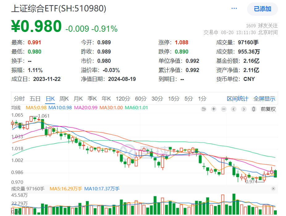上證指數跌逾1%,上證綜合ETF(510980)回調跌0.91%_風聞
