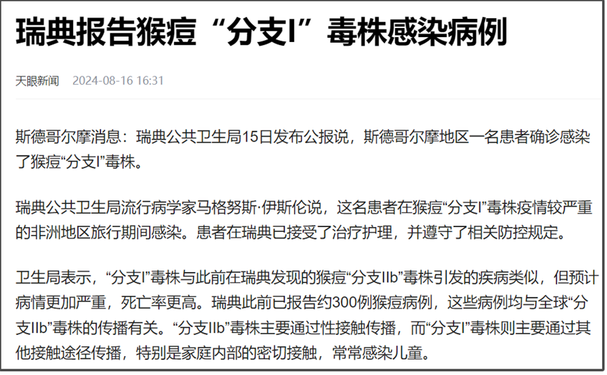 瑞典已經在8月15日報告了1例猴痘“分支一”毒株感染病例。