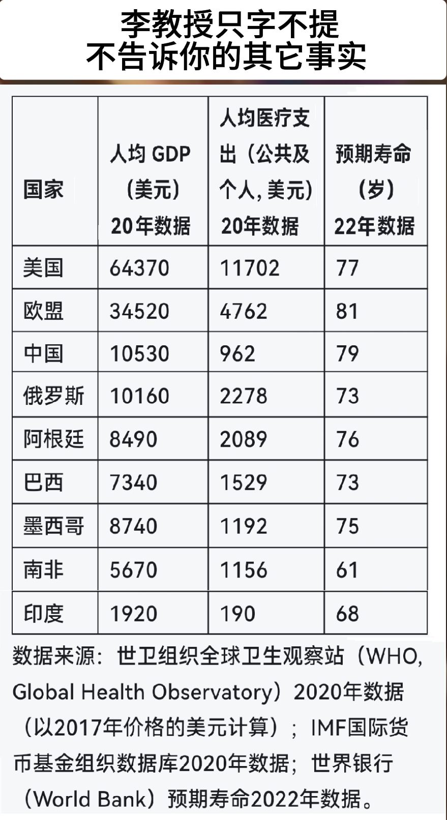 美國就是一個惡例,它是醫療市場化的國家,他拿出GDP的18%做醫療費,人均醫療費甚至超過我們的人均GDP。結果老百姓還是看不起病。——美國確實不是免費醫療。可是同樣依靠醫療保險的情況下,中美為什麼這麼大不同?我只能説這是社會主義的優越性了,不然呢?