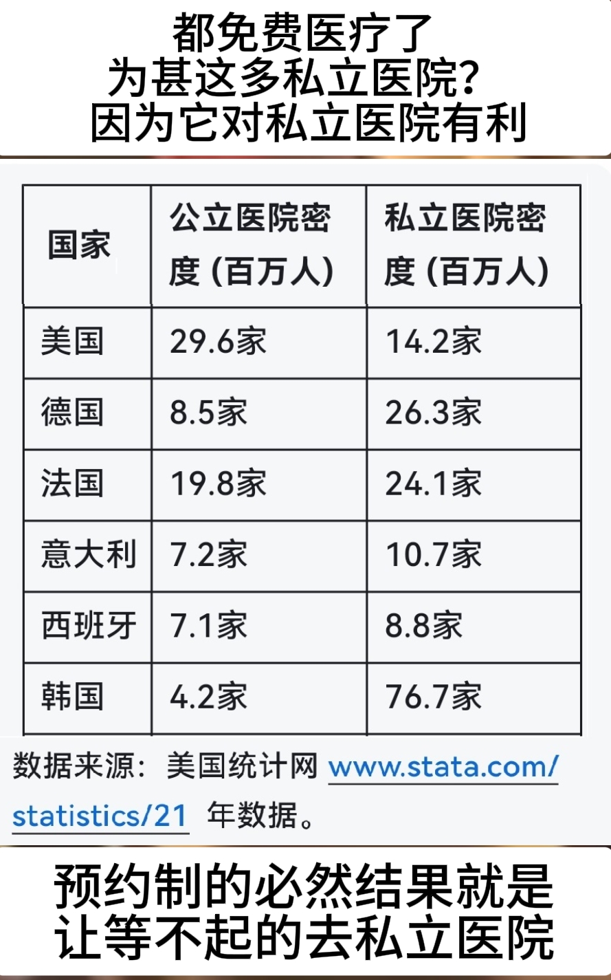 其次,既然免費醫療療效那麼好,又為什麼這些國家的私立醫院如此多?原因無他,即公立醫院為控制成本必然要控制就醫人數,預約制應運而生,而那些等不起的,怎麼辦?自己就去找私立醫院去了。然而,即便此舉控制了成本,可是成本真的控制住了嗎?上表數據顯示,也沒控制住,依然比中國花的多的多。效率與效果可見一斑了。