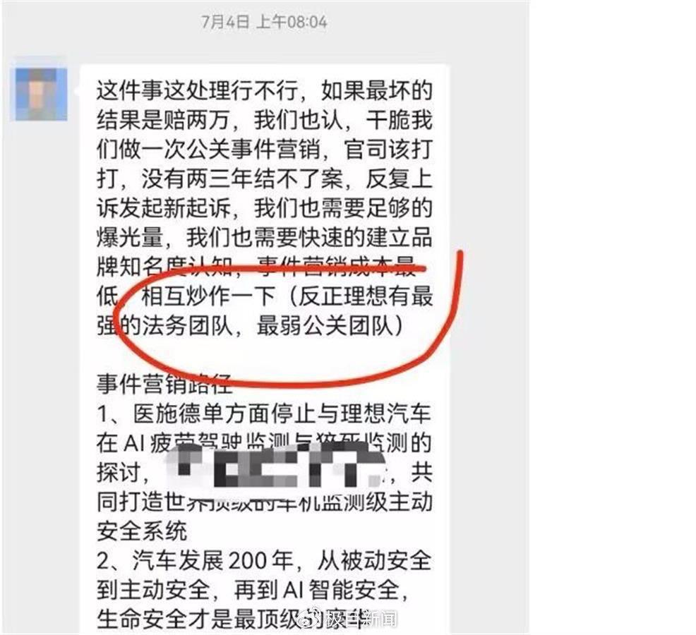 6月25日,理想汽車向醫施德公司發送律師函,要求其停止侵權行為並承擔相應法律責任。7月3日,自稱為醫施德公司工作人員的周某某,與理想汽車法務部取得聯繫。雙方溝通道歉事宜期間,周某某提出藉此事進行營銷炒作的方案,理想汽車予以拒絕。