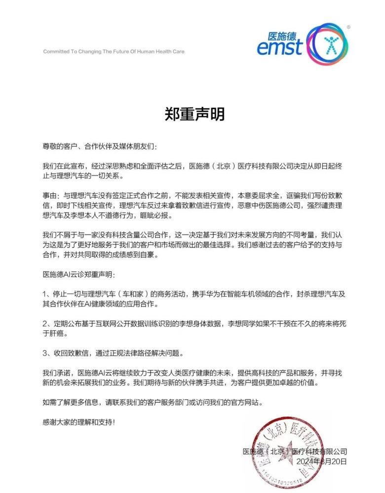 該聲明稱,公司決定從即日起終止與理想汽車的一切關係。而該聲明做出前述決定的原因,與其聲稱的理想汽車此前借其致歉信進行宣傳、惡意中傷醫施德公司的舉動有關。該聲明甚至還公然放話,“李想同學如果不干預在不久的將來將死於肝癌”。