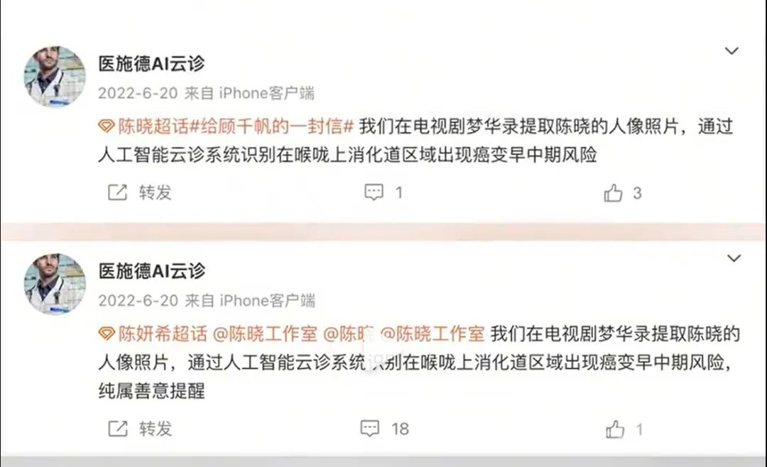 其中,在此前的微博中,“醫施德AI雲診”稱其數據是基於互聯網公開數據訓練結果。而其對陳曉的“雲診”,則是其在電視劇《夢華錄》提取陳曉的人像照片,通過人工智能雲診系統識別在喉嚨上消化道區域出現癌變早中期風險。