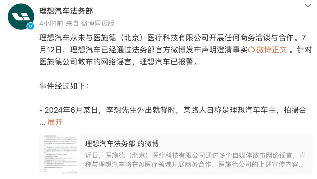 時間回撥至7月12日,彼時理想汽車法務部在官博表示,近日,醫施德(北京)醫療科技有限公司通過多個自媒體散佈網絡謠言,宣稱與理想汽車將在AI醫療領域開展商務合作。對此,理想汽車法務部稱,醫施德公司的上述宣傳內容沒有任何事實依據,屬於造謠和欺騙消費者。
