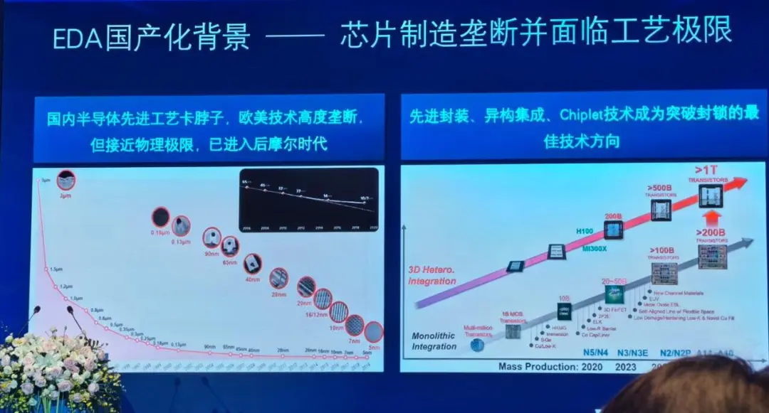 “EDA國產化的背景主要有兩大因素推動:一是國內半導體先進工藝卡脖子,歐美技術高度壟斷,但接近物理極限,已進入後摩爾時代。二、先進封裝、異構集成、Chiplet技術成為突破封鎖的最佳技術方向。” 芯和半導體產品應用總監蘇周祥分析説。