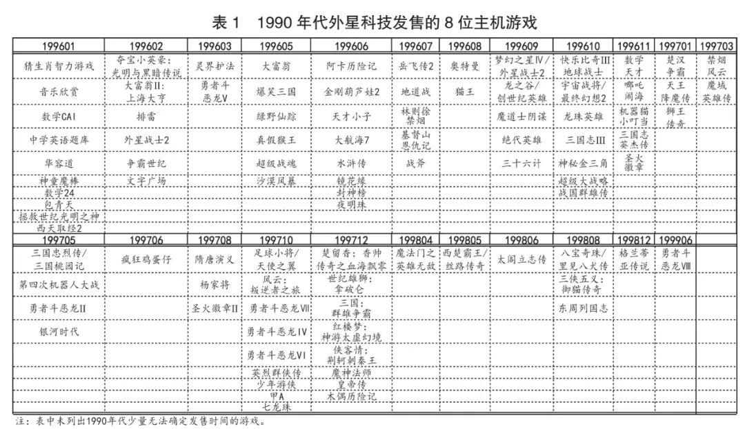 故討論1990年代的中國遊戲史,城市內景中的電子遊戲是繞不開的話題。就研究中國遊戲史的思想譜系而言,應將考察重點置於國產電子遊戲的產銷實踐(主要是國產8位主機遊戲的產銷實踐),只有它才能將我們帶入中國遊戲史的本土問題意識。1990年代,至少有5個“公司”產售8位主機遊戲。應予關注的是1993年成立的外星科技。這家公司在1996年到1998年至少發售了百款該類遊戲(見表1),約佔市場總量的77.52%。這些遊戲主要的設計策略包括漢化、移植、換皮與“原創”等。前兩種純屬商業目的,後兩種則與國產電腦遊戲共享了相同的問題意識,即在遊戲中表達中國的在場。但並無資料顯示這些遊戲與民族主義情緒存在直接連接,它們更像是本能地採用國人熟悉的文化題材以獲取商機,其中看不到超越性的維度。
