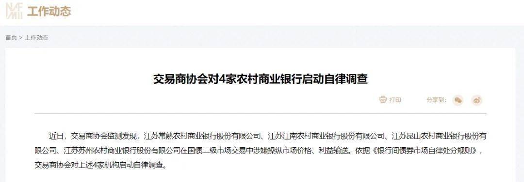 近日,中國銀行間市場交易商協會(以下簡稱:交易商協會)發佈了一則重要通報,因涉嫌國債交易違規,江蘇省內4家農商行罕見被通報。