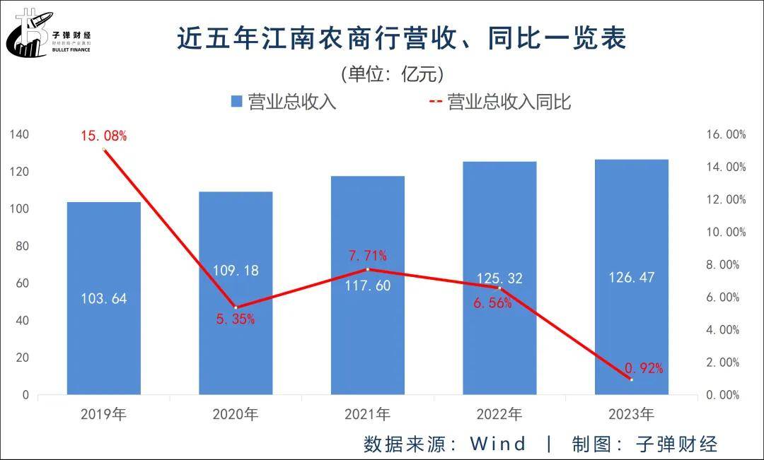 儘管在資產規模上,江南農商行處於江蘇農商行領頭羊的地位,但2023年營收情況卻差強人意。