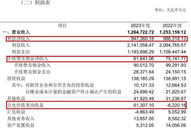公允價值變動收益一項大幅增長,使總營業收入勉強呈現正增長。2023年江南農商行公允價值變動收益實現6.13億元,比2022年增加了6.75億元。