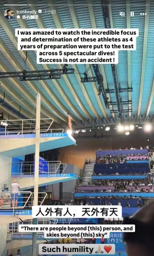 美國橄欖球GOAT湯姆-布雷迪,在觀看巴黎奧運會女子10米台比賽後,專程用中文向中國跳水夢之隊發出致敬:“人外有人、天外有天”。崇敬之情,以及“蹭熱度”之心溢於言表。