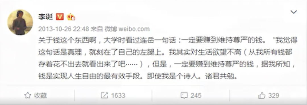 2013年李誕還很正經,認真説賺錢很重要,一定要賺到維持尊重的錢。這是他刻在左腿上的名人名言。