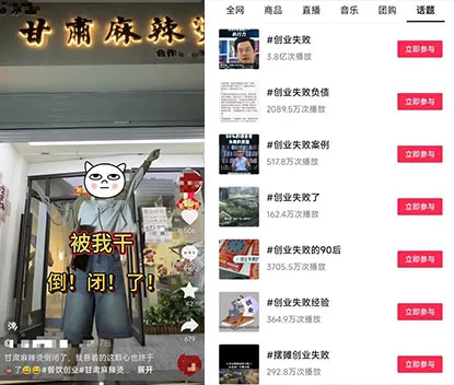 不止天水麻辣燙,其實火鍋餐飲中,有許多人早就發現,發佈自己創業失敗、扔店倒閉的視頻,往往點贊觀看量居高不下。