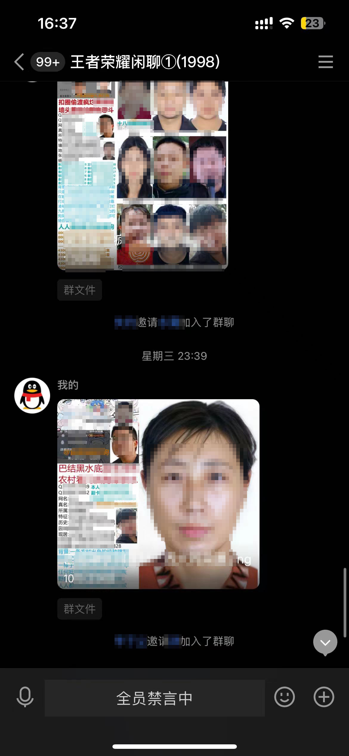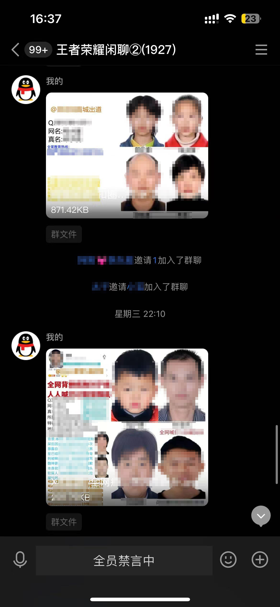 4月下旬,澎湃新聞記者進了三個名為“英雄聯軍閒聊”(後更名為“王者榮耀閒聊”)的QQ羣,它們當時建羣均有兩個多月,每個羣有六百多到一千餘人。據知情人介紹,這是佔奕專門發開盒信息的QQ羣。