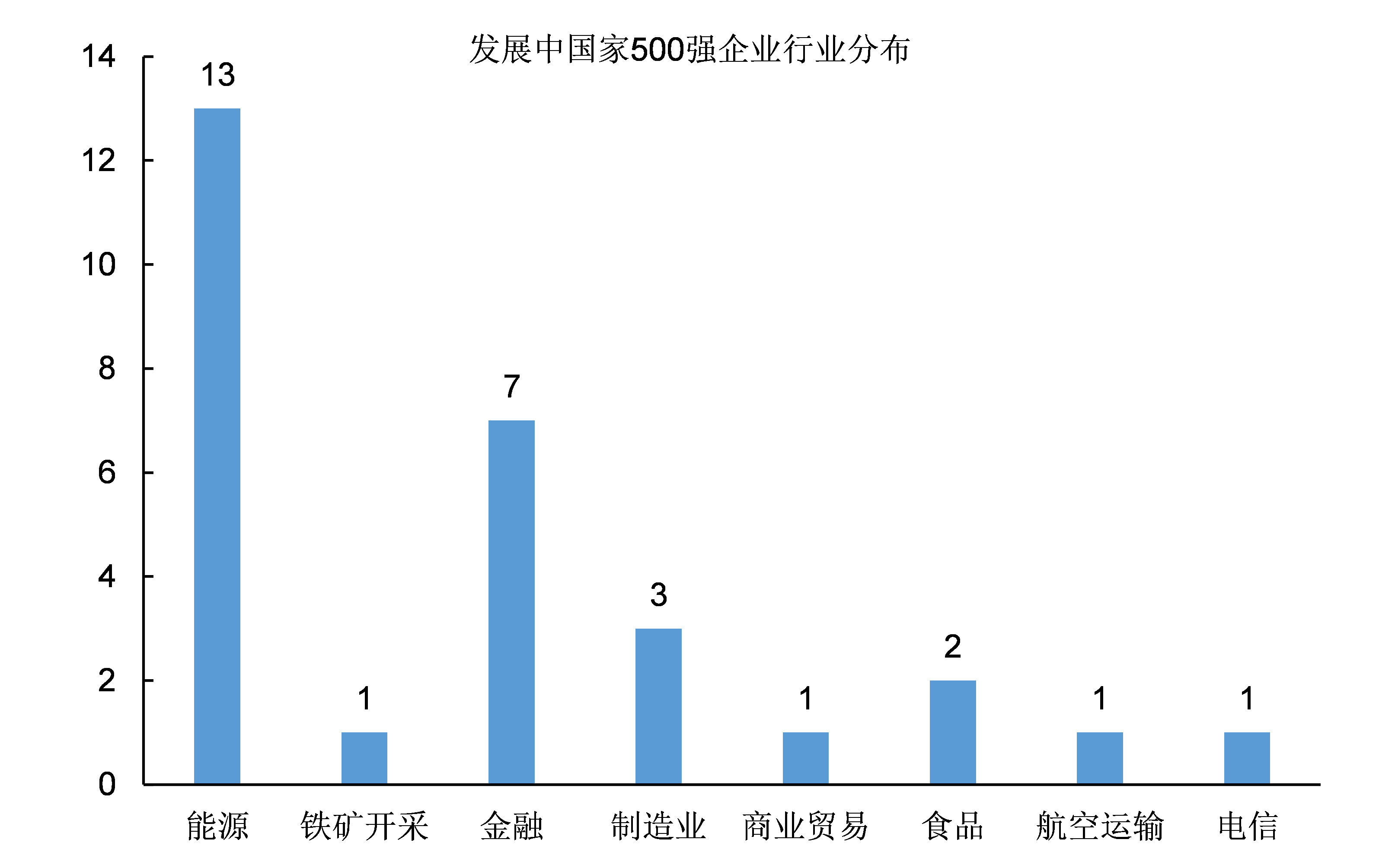 2、在這10個國家的29家上榜企業中,來自能源行業(石油天然氣和電力)的企業數量最多,達到13家;其次來自金融行業的企業,數量為7家;從事製造業的企業只有3家,剩下的6家企業來自航空運輸、食品、貿易等行業。