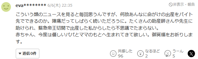 每次看到這樣的新聞都會想,為什麼能在打工的地方那麼拼命地生孩子呢?陣痛也持續了一段時間吧。對於在很多助產師幫助下緊急剖腹產的我來説,真是不可思議。