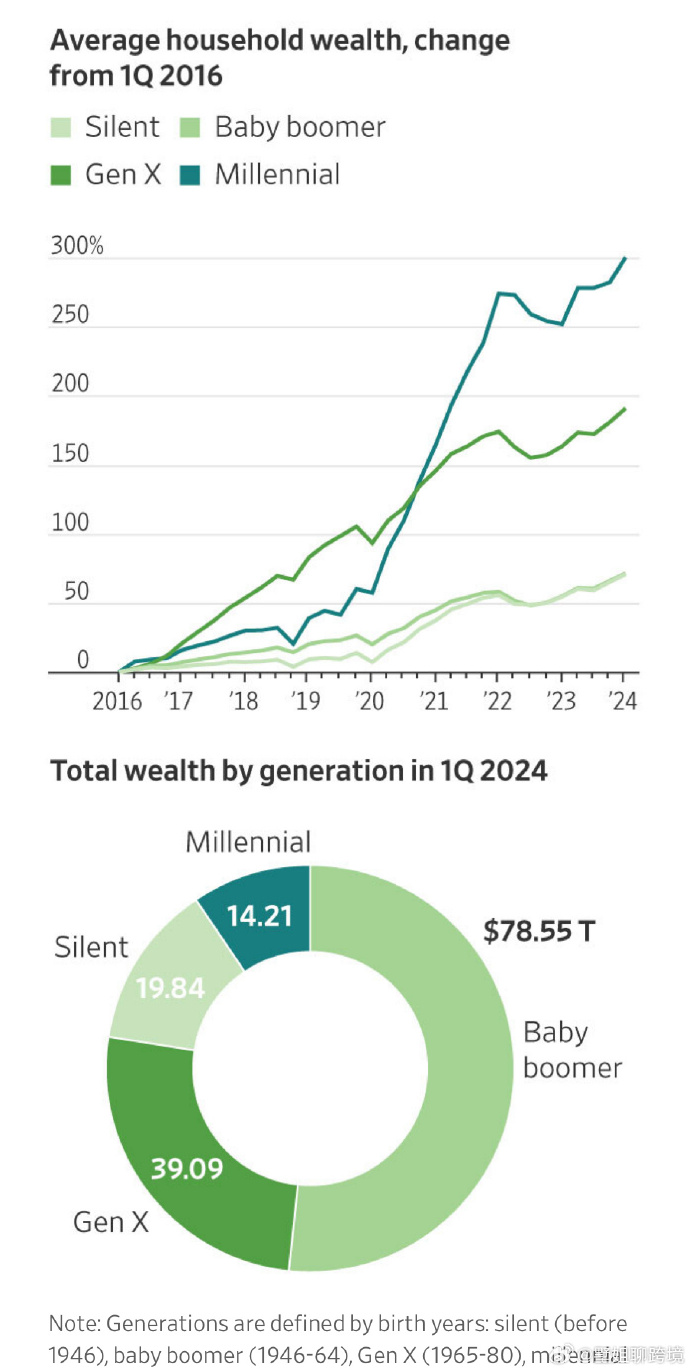 WSJ這篇很有趣,很多人覺得美國老一代人有錢,但千禧一代也不差,甚至比前幾代人在同齡時更富有。只是貧富差距更明顯了。