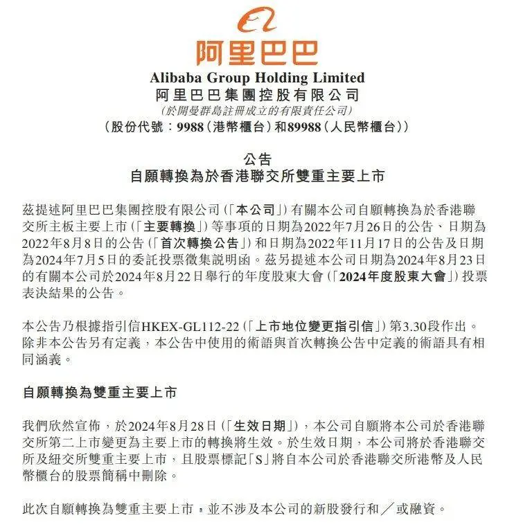 8月23日早晨,阿里巴巴發佈公告,宣佈新增香港為主要上市地,將於8月28日在香港聯交所主板主要上市,成為在港交所、紐交所雙重主要上市的公司。