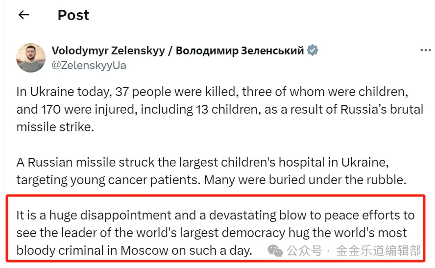 澤連斯基在社交媒體X發文稱:“在今天這樣一個日子,看到世界上最大民主國家的領導人和世界上最血腥的罪犯相擁,極度令人失望,這是對和平努力的毀滅性打擊。”(“這樣一個日子”指當天烏克蘭一家兒童醫院遇襲,醫院裏面住了很多罹患癌症的烏克蘭兒童。)
