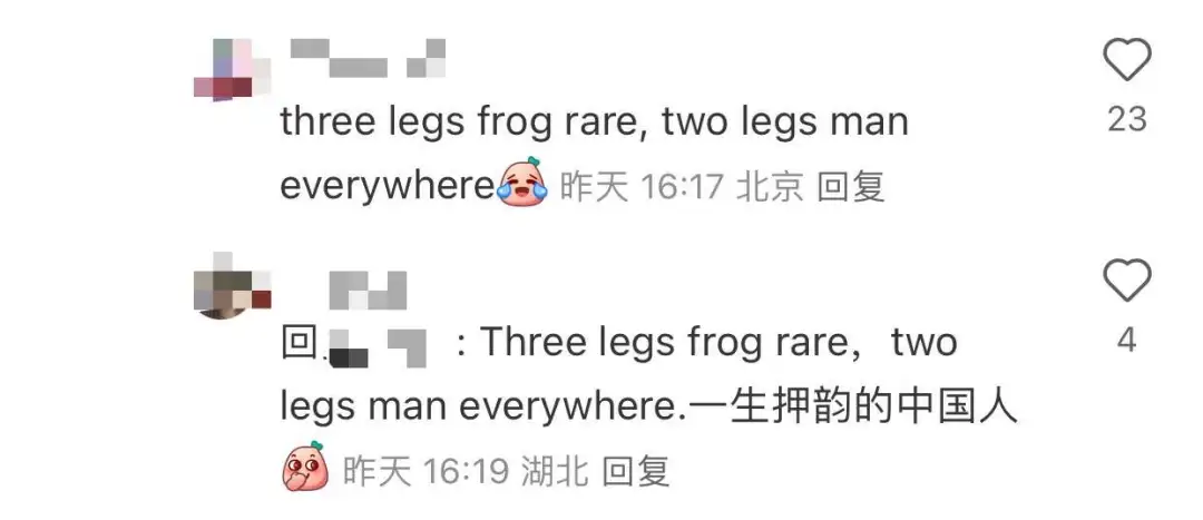 還是three legs frog rare,two legs man everywhere skr~翻譯三大要點信達雅齊了。