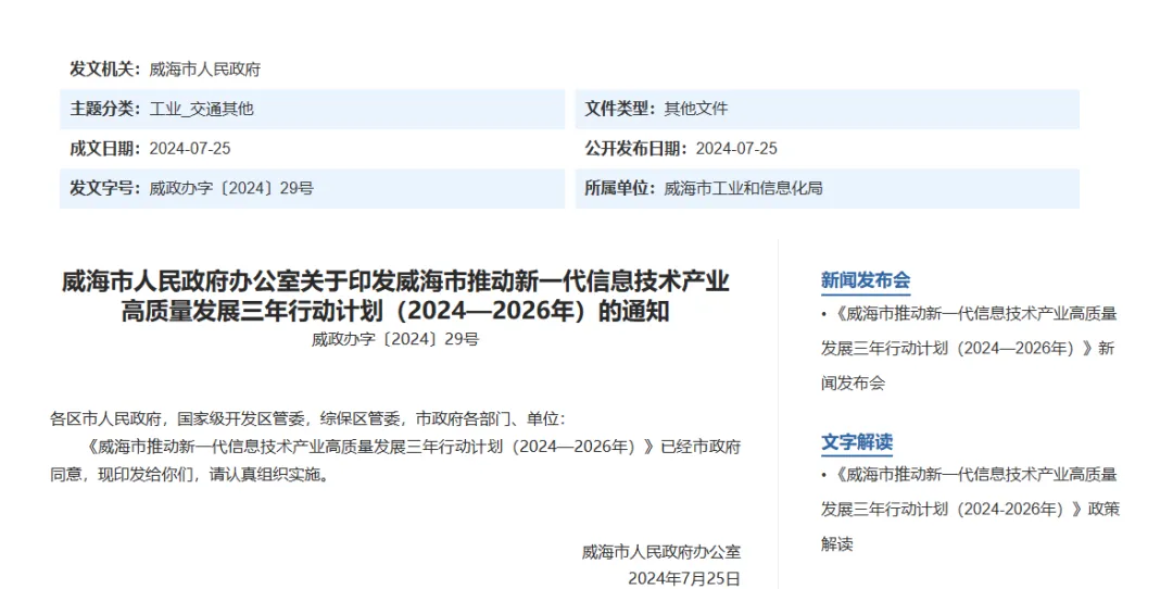 8月22日,**《威海市推動新一代信息技術產業高質量發展三年行動計劃(2024-2026年)》**印發。