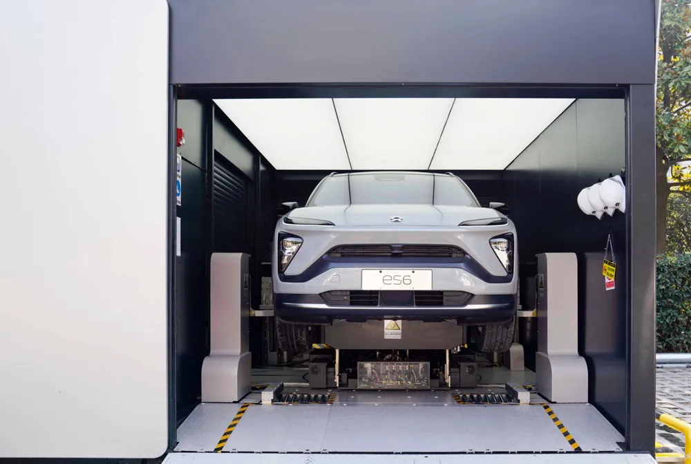 蔚來作為最早佈局換電的車企,目前採用的是“下裝式”換電方式,可實現最快3分鐘內完成對一塊動力電池的更換。