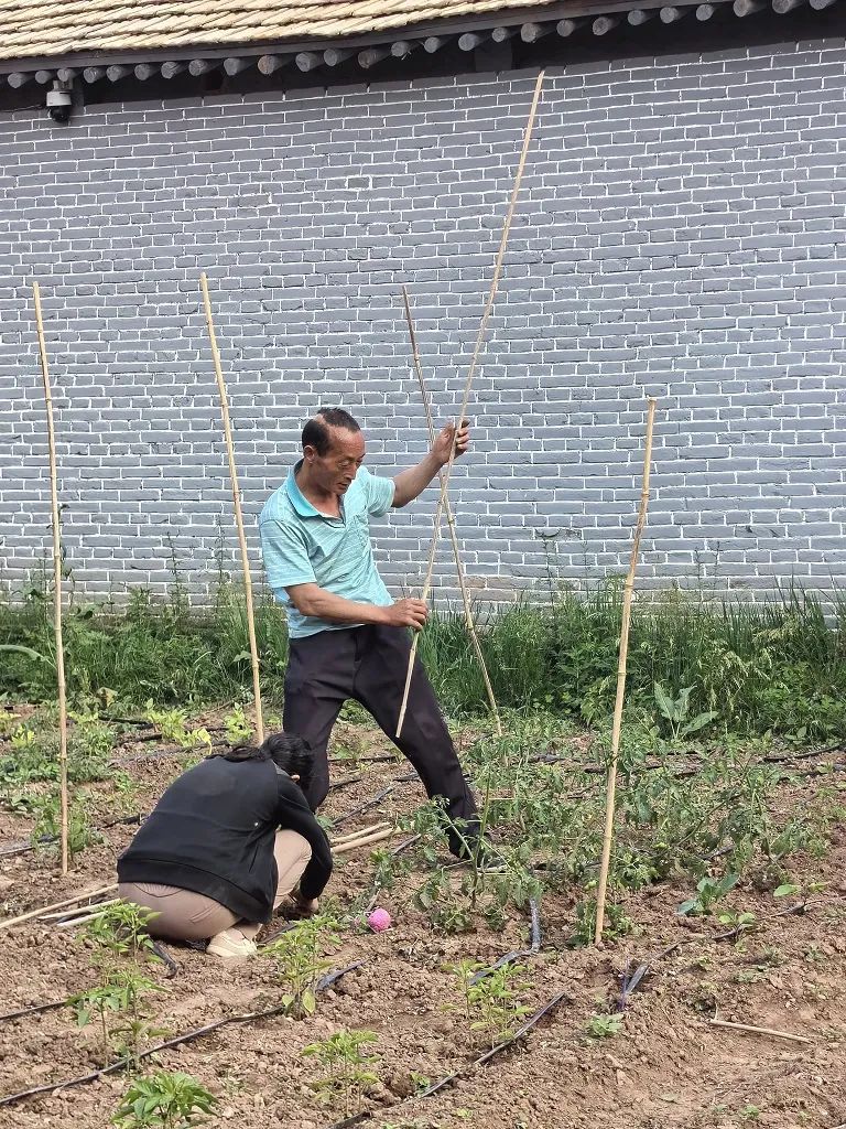 村民程秀萍和崔香連到貓盟小院的菜圃幫忙插竹竿 ©王君