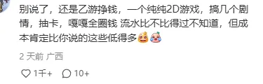 然而姬看到,有人對此發出了感嘆——即便這款國產單機大作已是現象級產品,但相比起那些特別賺錢的熱門網遊,仍在收入方面有較大差距。
