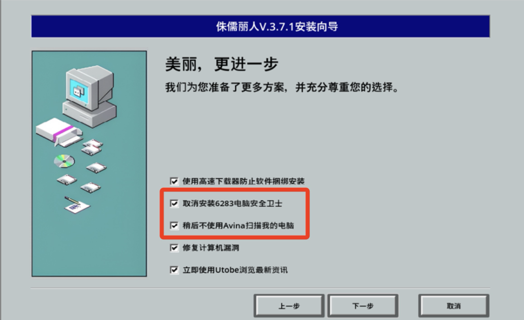 比如説它會玩一些文字遊戲,你以為把所有勾都取消就不會安裝垃圾軟件,但有幾個打勾的選項,上邊寫的是取消安裝、不使用。