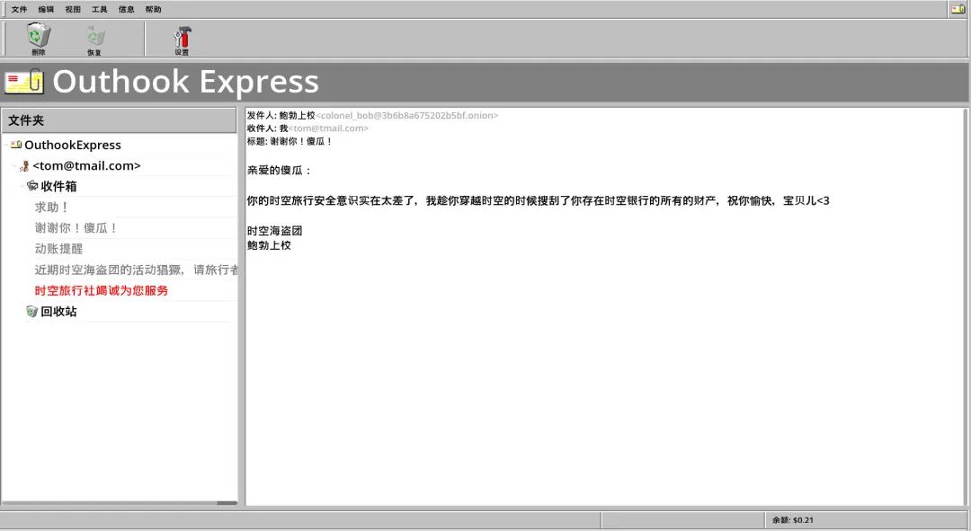 郵件裏顯示,你是一個訂購了時空旅行社服務的未來人類,穿越到了 1999 年 4 月 1 日。如果想要回去,就要再繳納 30 萬元。