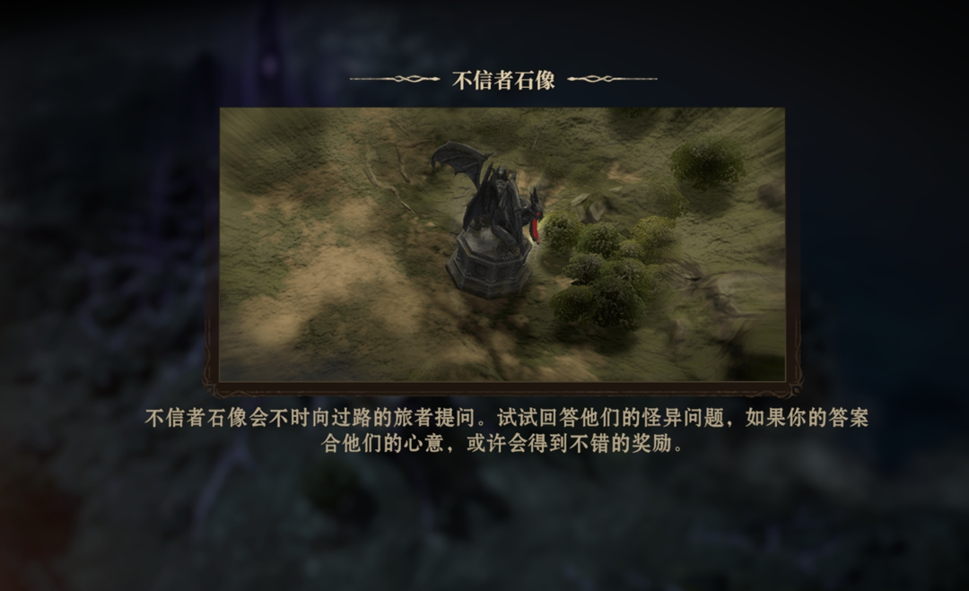 舉個例子,“撿垃圾”是許多遊戲大世界的基礎體驗,《龍息:神寂》也不例外,走幾步路都能看到各種材料、解密或者是奇遇內容。比如讓我印象很深的“不信者石像”,與石像交互後,他們會提出問題,並要求你揣測哪個回答最符合他的心意。