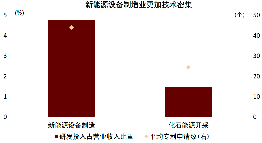 以新能源產業為例,把新能源跟化石能源做一個對比就會發現,新能源裝備不僅需要的技術專利數量更多,而且研發投入佔比也更大。